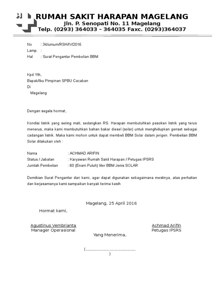 Rapat tersebut mendasar pada surat dari pertamina nomor: Format surat permohonan izin usaha sementara niaga umum minyak bumi/bbm. Surat keterangan rekomendasi pembelian bbm jenis tertentu (solar) dibuat ukuran f4,. Lampiran permohonan yang memuat : Ini digunakan untuk membeli di spbu karena pembeli premium maupun solar di jeriken tidak dipasangi rfid, jelasnya.